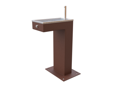 Fonte de 85 cm de altura, com corpo de chapa de aço zincado com proteção antioxidante e tinta de cor castanho, cano e pulsador de latão acabamento cromado mate e grelha e bandeja interior de aço inoxidável AISI 316L, colocação com marco de aço galvanizado e pernos de ancoragem. | ||
