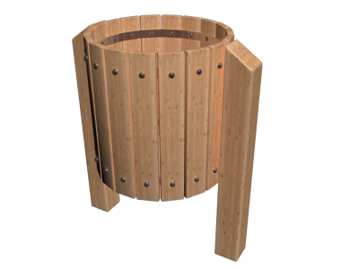 Lixeira, de 50x30x80 cm e 26 litros de capacidade, com corpo de madeira, colocação com bucha química, arruela e parafuso. | ||