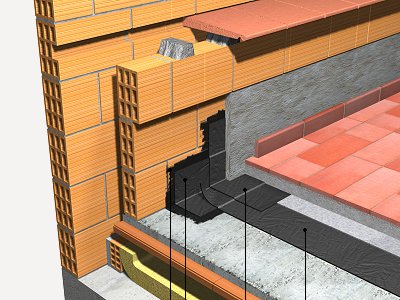 Encontro de cobertura plana acessível, ventilada, com piso fixo, tipo convencional com paramento vertical; através da realização de um afastamento perimetral de mais de 5 cm relativamente ao paramento vertical e mais de 20 cm de altura sobre a proteção da cobertura, enchimento com argamassa de cimento, confeccionada em obra, dosificação 1:8 colocada sobre a impermeabilização soldada por sua vez ao suporte e formada por: banda de reforço de 50 cm de largura, realizada a partir de membrana de betume modificado com elastômero SBS, de 3,5 mm de espessura, com armadura de feltro de poliéster não tecido de 160 g/m², de superfície não protegida, totalmente aderida ao suporte com maçarico, prévia aplicação de primer com emulsão asfáltica aniônica com cargas. Arremate com banda de acabamento de 50 cm de desenvolvimento com membrana de betume modificado com elastômero SBS, de 3,5 mm de espessura, com armadura de feltro de poliéster não tecido de 160 g/m², de superfície não protegida, acabamento com um revestimento de rodapés de grés rústico, de 7 cm, 3 €/m colocados com junta aberta (separação entre 3 e 15 mm), em camada fina com cimento cola de pega normal, C1 sem nenhuma característica adicional, cor cinza e rejuntamento com argamassa de rejuntamento cimentosa melhorada, com absorção de água reduzida e resistência elevada à abrasão tipo CG 2 W A, cor branco, para juntas de 2 a 15 mm, formação de ventilação perimetral da caixa de ar com bloco cerâmico furado, e colocação de arremate inferior cerâmico de 11x24 cm, fixado ao paramento, como arremate da ventilação perimetral da caixa de ar.