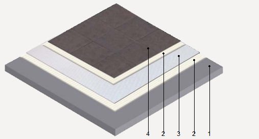 | Dessolidarização sob piso cerâmico ou de pedra natural, com lâminas de elastômero de celúlas fechadas | ||