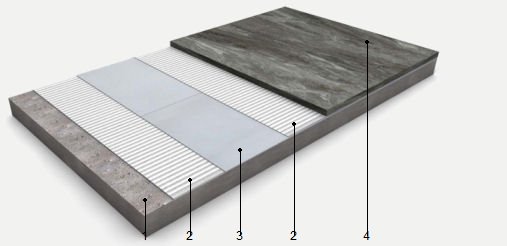 | Dessolidarização sob piso cerâmico ou de pedra natural, com lâminas de elastômero de celúlas fechadas | ||